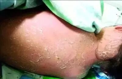 “入院时患儿眼睑红肿,有脓性分泌物覆盖,睁眼困难;口周皮肤呈放射性皲裂;颜面部、颈部皮肤大片状脱皮,皮肤剥脱后露出潮红的糜烂面,似烫伤样外观。腋下及会阴部皮肤均潮红糜烂,且患处皮肤疼痛剧烈,轻微触碰就哭闹不止!”当日,接诊的医生描述,孩子入院时的情况让人触目惊心。