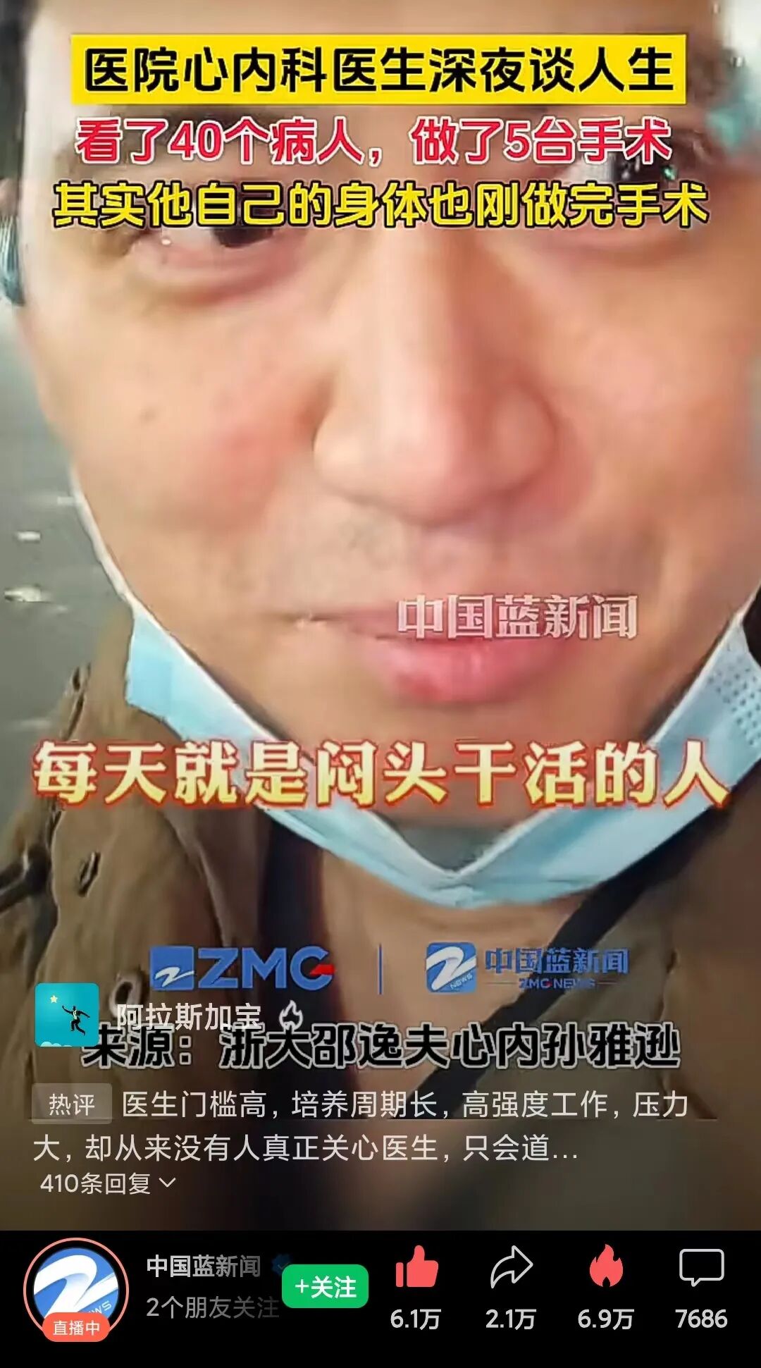 1月15日,浙江大学医学院附属邵逸夫医院心内科孙雅逊主任医师深夜发了一个视频,与千万网友夜谈人生,令人感到心酸。随后该视频被浙江广播电视集团等多家新闻媒体广泛转发,引起了网友的强烈关注!发布视频时,已是凌晨深夜,孙医生夜间12点才下班,而他自己一个多月前刚做完甲状腺癌手术。他在视频中有些哽咽(感情充沛,语气低沉)地说道:“今天看了40个病人,做了5台手术,其中4台是房颤,最后一台房扑非常难做,当时做的时候,我就在想人这一辈子呀,到底是为什么而活呢?这一辈子大部分时间都花在手术台上了。我在想,什么样的人会当医生呢?可能就是对自己生活要求也不高,没啥兴趣爱好,每天就是闷头干活的人,这样的人可能适合当医生……”大病初愈,自己身体也不好,一天竟然看了40个病人,做了5台手术,熬到凌晨12点才下班,如此高强度的工作,就是铁打的身体也吃不消。很多医生在看到这个视频后产生了深深的共鸣。四川华西医院消化内科一名医生在看到这个视频后,内心受到了极大触动,她表示:“医生从业门槛高,培养周期长,工作强度大,心理压力重,责任比天高,能坚持下来的都是了不起的。无论我们再苦再累,媒体再怎么宣传我们的不容易,可社会大众好像都从来没有真正关心过我们医生,只会道德绑架,要求我们无私奉献。我和这位同行一样,也是经常熬到深夜下班,现在身体状况很差,脱发严重,月经紊乱,我经常一天要看八九十个病人,一个接着一个,不敢喝水,怕上厕所。我真的好累,家庭方面也照顾不到,到底什么样的人才适合当医生呢?恐怕就是那种不怕苦不怕累,只懂得默默奉献的人。”嘉兴一名医生在看到这个视频后瞬间坐不住了,他说道:“真的很奇怪,在大家的眼里,似乎只有那种不要工资、不挣钱、无私奉献白干活、燃烧自己照亮别人的医生才是高尚的好医生,只要你挣了患者的钱,那你就是没有医德。咋滴,难道医生不吃饭了吗?医生只是一种职业,也需要生存呀,超市也收你的钱,你为什么不骂超市呢?身在底层,各行各业都很累,医生都是凭良心的工作,大家都不容易,都是打工人,请不要再互相为难了!你来找我看病,我认认真真给你看,看完了,倘若能有效治愈,大家都高高兴兴的,无法治愈,除了我医术不精之外,可能就是现代医学的局限性,医生也没有办法,在诊疗的过程中,大家为什么就不能做到和和气气、互相理解呢?”6天内,3位知名年轻主任突然离世