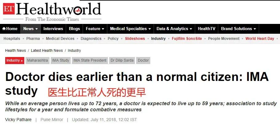 “医者不能自医”是句老话,“医者不寿”也是句老话,以前不懂,直到看了相关研究才明白这其中的含义。印度医生协会(IMA)曾做过一项研究,发现医生的平均寿命仅为59岁,远远低于普通人的寿命72岁,差距有13年之久。研究人员表示,大部分去世的医生死于恶性肿瘤和心血管疾病;而活着的医生健康状况也不容乐观,45-55岁和55-65岁这两个年龄组的医生健康状态最为脆弱。另据《中国心血管病报告》显示,现有1/4的医师患有心血管疾病,医生的患病率比普通人群的患病率要高出25%。其中,1/2的医生患有高血压,40岁以上的男性医师患病率是普通群体的2倍。各位看一看,想一想,面对如此高的医生心血管发病率,医生怎么能长寿得了?中国医师协会曾资助一项研究,报告了中国医生2013-2015年因过劳而猝死的情况,发现过劳死的医生人数由2013年的6人激增到了2015年的24人,其中以30-39岁正值壮年的医生最多。在猝死发生前,半数医生已经持续工作了8~12个小时,更有11名医生持续工作超24小时。然而,具体到科室,猝死比例最高的是麻醉科医生,达到了26%。据了解,发达国家的麻醉医师通常每年仅管理500-1000例病例,而中国约为1500例。这或许可以解释为什么过劳死最常发生在麻醉医生身上。此外,麻醉医生在从术前到术后的整个围手术期都需要保持高度紧张的状态,面对一台又一台手术的“持续输出”,麻醉医生无疑成了整个手术室最疲惫的人。医生猝死接连不断,那行,发现了这个问题,我们该找找原因了!https://mp.weixin.qq.com/s/xZLcAPmq0ma1vXbZvqfofw